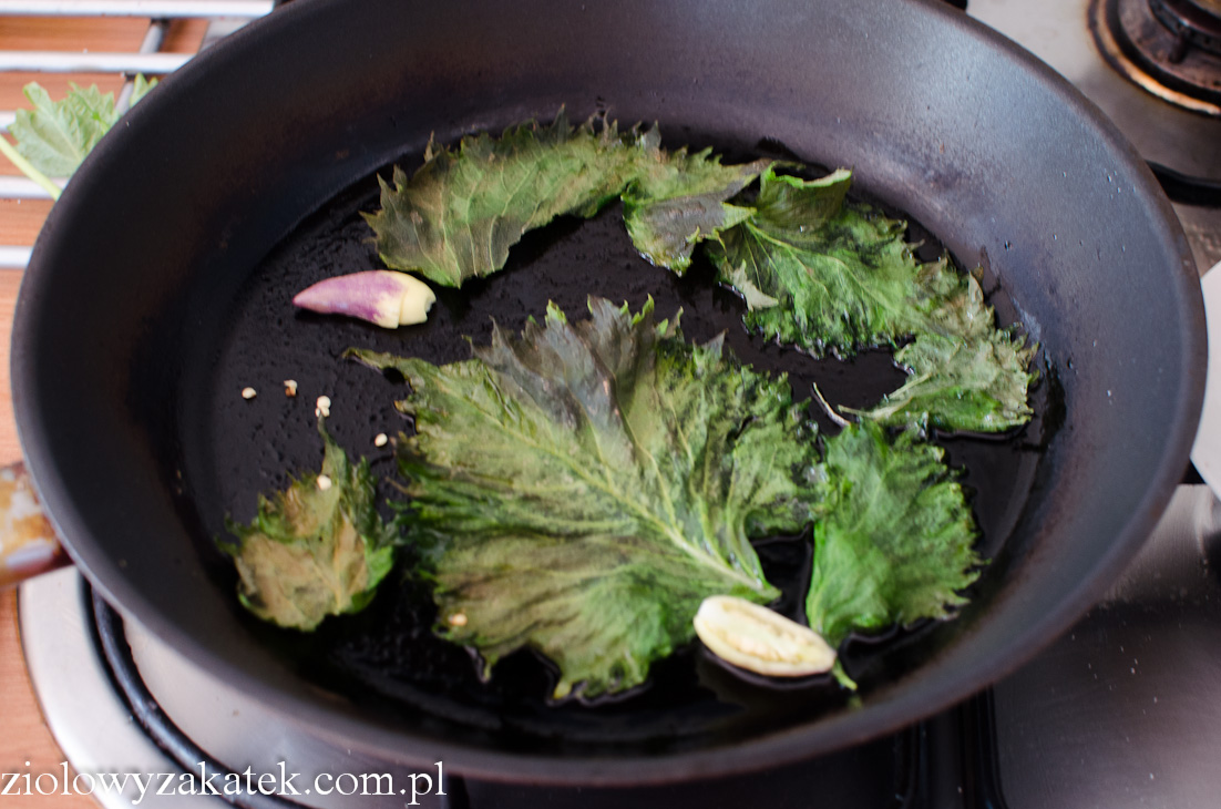 Na patelnii rozgrzewamy olej do smażenia lub klarowane masło. Wrzucamy teraz nasze zioła (u mnie shiso, bazylia tajska), czosnek i chilli, smażymy, aż zacznie wydzielać się intensywny aromat. Usuwamy papryczkę chilli oraz cały czosnek (opcja dla osób, które nie lubią ostrości – można papryczkę zostawić i po prostu pamiętać, żeby nie zjeść jej w całości:)).