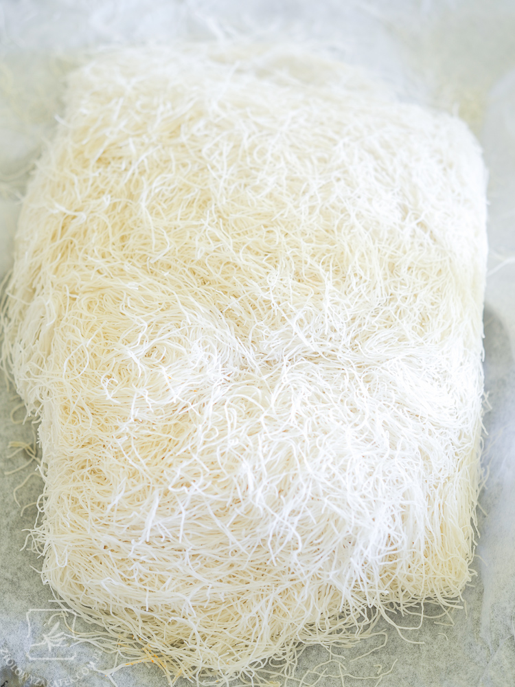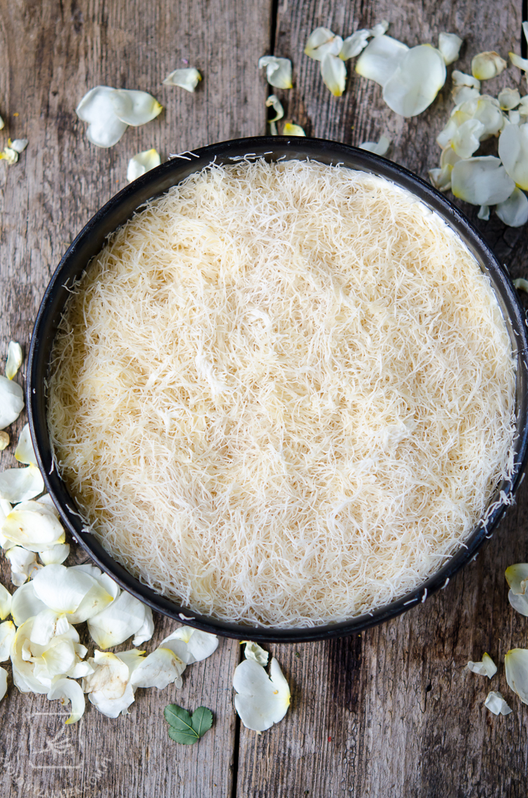 Ciasto knafeh nazywane też czasem ciastem kadaif, to w uproszczeniu „pocięte ciasto filo” – jest bardzo cieniutkie i delikatne, sprzedawane w formie cienkich, długich nitek. Ciasta praktycznie nie wykonuje się w domu (zresztą tak jak ciasta filo, czy ciasta na turecku borek), kupuje się je jako gotowy półprodukt. W Polsce można zakupić je w kuchniach świata lub zamówić przez Internet (ja kupiłam w sklepie arabskie.pl). Surowe ciasto knafeh wygląda w taki sposób: