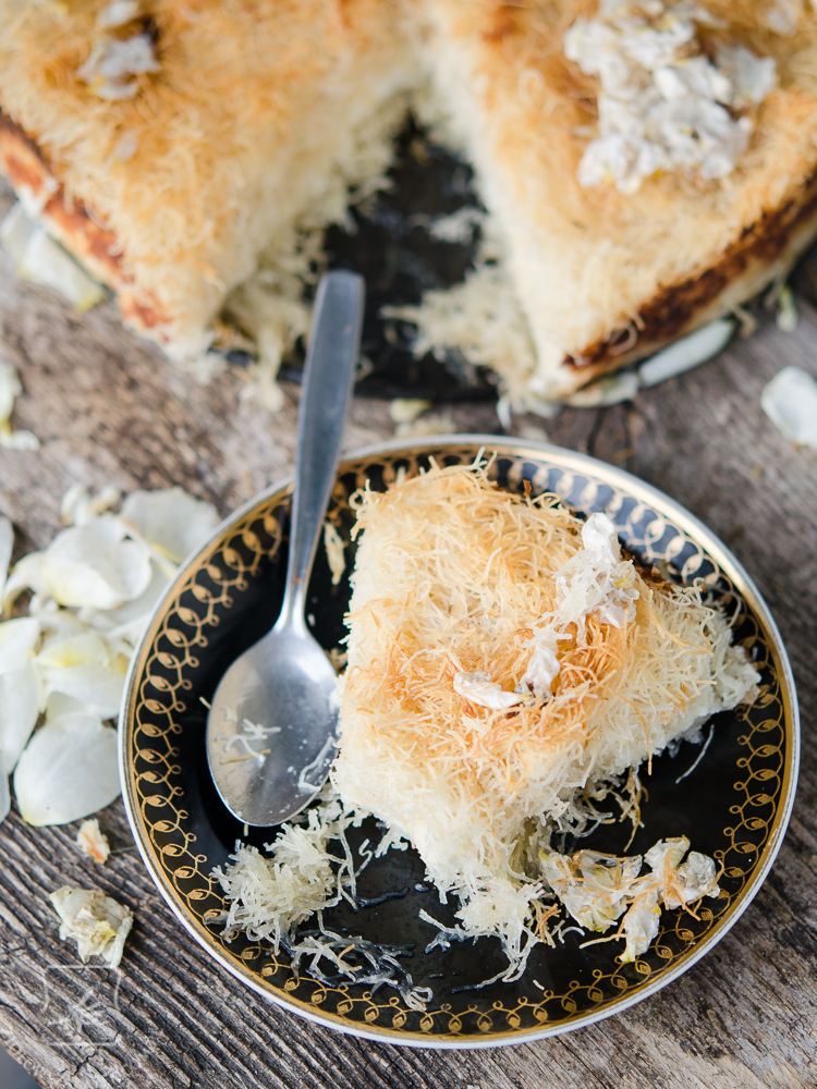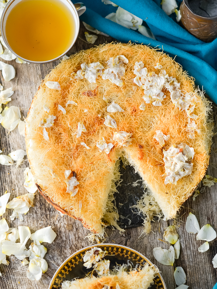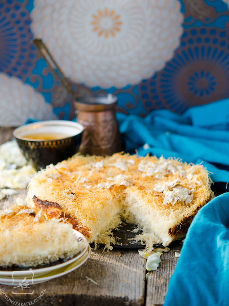 Oprócz tagine (o którym innym razem) zrobiłam długo wyczekiwany przeze mnie bliskowschodni deser – kunafę. Kunafa to rodzaj ciasta przygotowanego z cieniutkiego ciasta knafeh (w poście zobaczycie dokładnie jak wygląda), przełożonego serem ricotta oraz syropem różanym, który przygotowałam od podstaw używając płatków róży pachnącej.