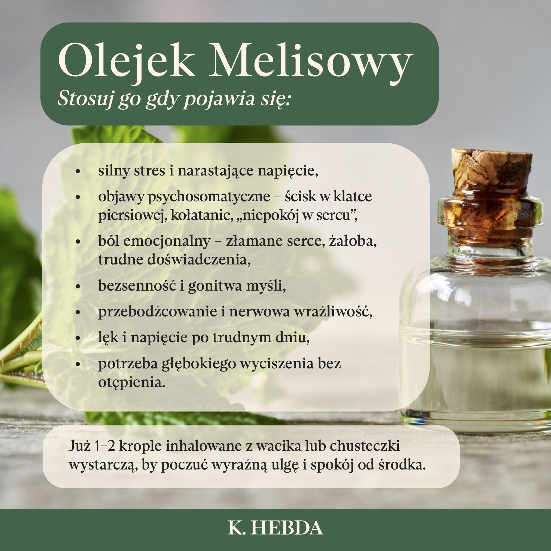 - Stres, napięcie, niepokój – kilka minut inhalacji pozwala uspokoić tętno, rozluźnić oddech i przywrócić poczucie wewnętrznej równowagi. Melisa jest jednym z olejków, które działają szybko i wyraźnie, szczególnie przy napięciu „z głowy”, przeciążeniu obowiązkami i przebodźcowaniu.