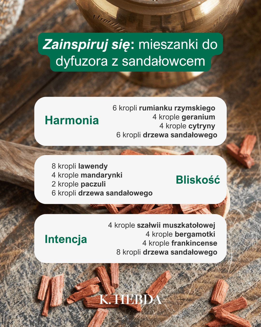 Do dyfuzora, ale nie tylko… Mieszanki olejków eterycznych możesz stosować również na tkaniny, robić inhalacje lub stosować na skórę (po wymieszaniu z olejem bazowym). Oto kilka propozycji na relaksujące blendy z olejkiem sandałowym w roli głównej: