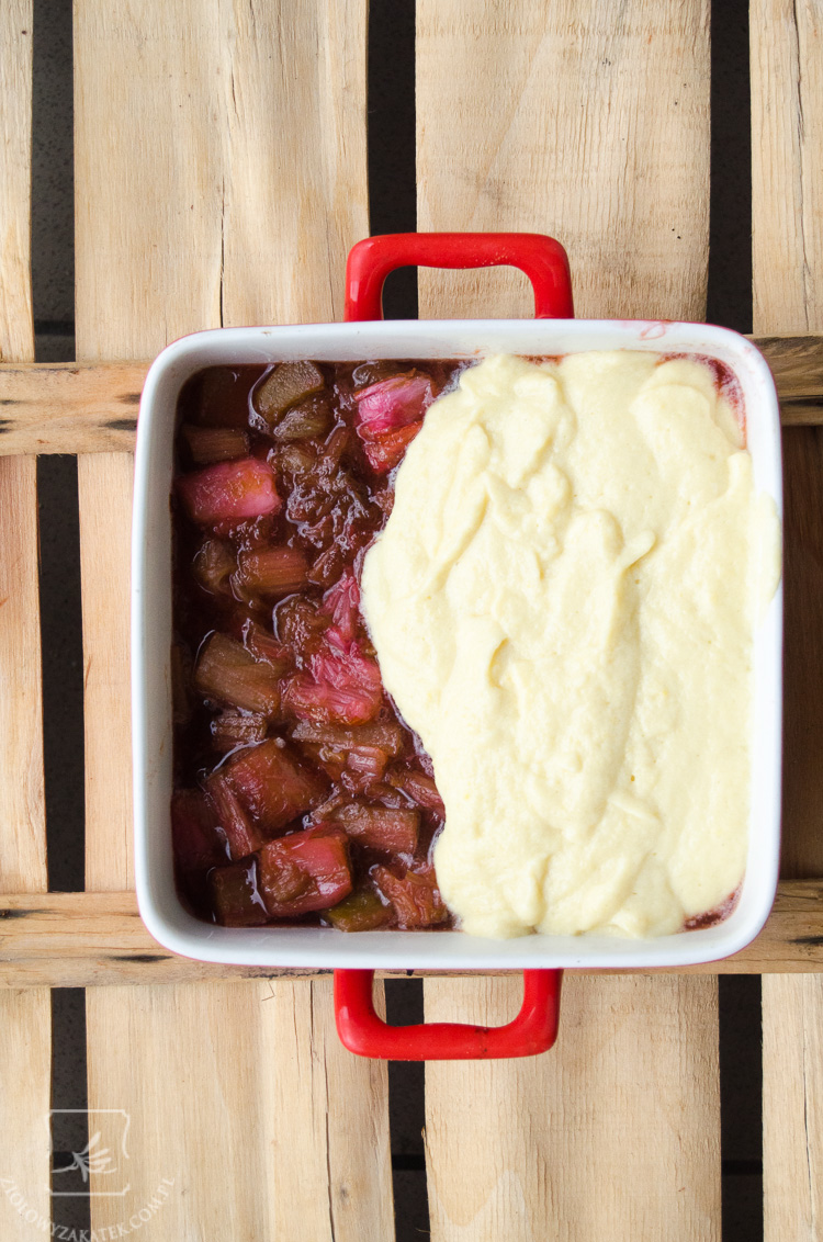 Wyciągamy naczynie do zapiekania, wkładamy do środka rabarbar i odstawiamy na bok. Nagrzewamy piekarnik do 190 C (ja mam zwykły, nie termoobieg) W tym czasie przygotujemy krem.