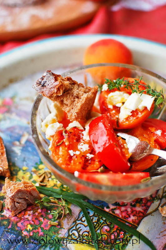 Po co w ogóle grillować morele? Po przygodach z grillowanymi truskawkami odpowiadam: a dlaczego nie? Ot dla zabawy, fanaberii, z ciekawości, aby fajnie połączyć tekstury, wydobyć z owoców inny smak.. Pierwsze zastosowanie grillowanych owoców, które przyszło mi do głowy, to deser, jednak po chwili zastanowienia, postanowiłam połączyć je z dojrzewającą szynką, lekko słonym serem feta, soczystymi, dojrzałymi pomidorami, tymiankiem i z prażonymi ziarnami kopru włoskiego. Wszystko polane odrobiną oliwy z oliwek i octu winnego.
