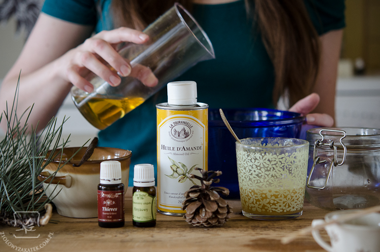 W tym miejscu bardzo proszę, żebyście używali olejków naturalnych, przeznaczonych do nakładania na skórę. Ja używam olejku firmy Young and Living – jest to jedna z najlepszych, jeśli nie najlepsza na świecie, firma produkująca olejki eteryczne o jakości terapeutycznej. Ten konretny „Thieves” pachnie korzeniami – składa się z rozmarynu, goździków, gałki muszkatołowej, szałwi… Kto był na Andrzejkach z Ziołowym Zakątkiem, ten wie jak bosko pachnie :-) Na koniec dodałam także troszkę olejku anyżowego. O tych olejkach będę jeszcze mówić i pisać. Póki co, żeby nie uprzedzać faktów, zachęcam do kupowania olejków np. w sklepach zielarskich. Dwie polskie firmy mające dobrą renomę to Dr Beta oraz Awicenna.
