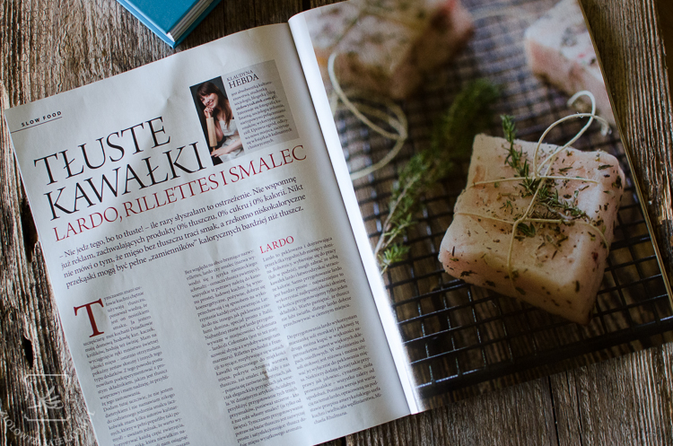 Jak pewnie część z Was wie, piszę felietony do Mojego Gotowania: dzisiaj chciałam Wam pokazać fragment numeru marcowego, do którego przytowałam tekst o tłustych kawałkach. Było lardo, rillettes (którym skarmiałam potem gości – świetnie się przechowują, koleżanki mogą potwierdzić, że wyszło pyszne:)), oraz mój ulubiony smalec. Nie boję się tłuszczu (przynajmniej na razie) i trudno mi ukryć przywiązanie do smalcu, zwłaszcza na weselach: