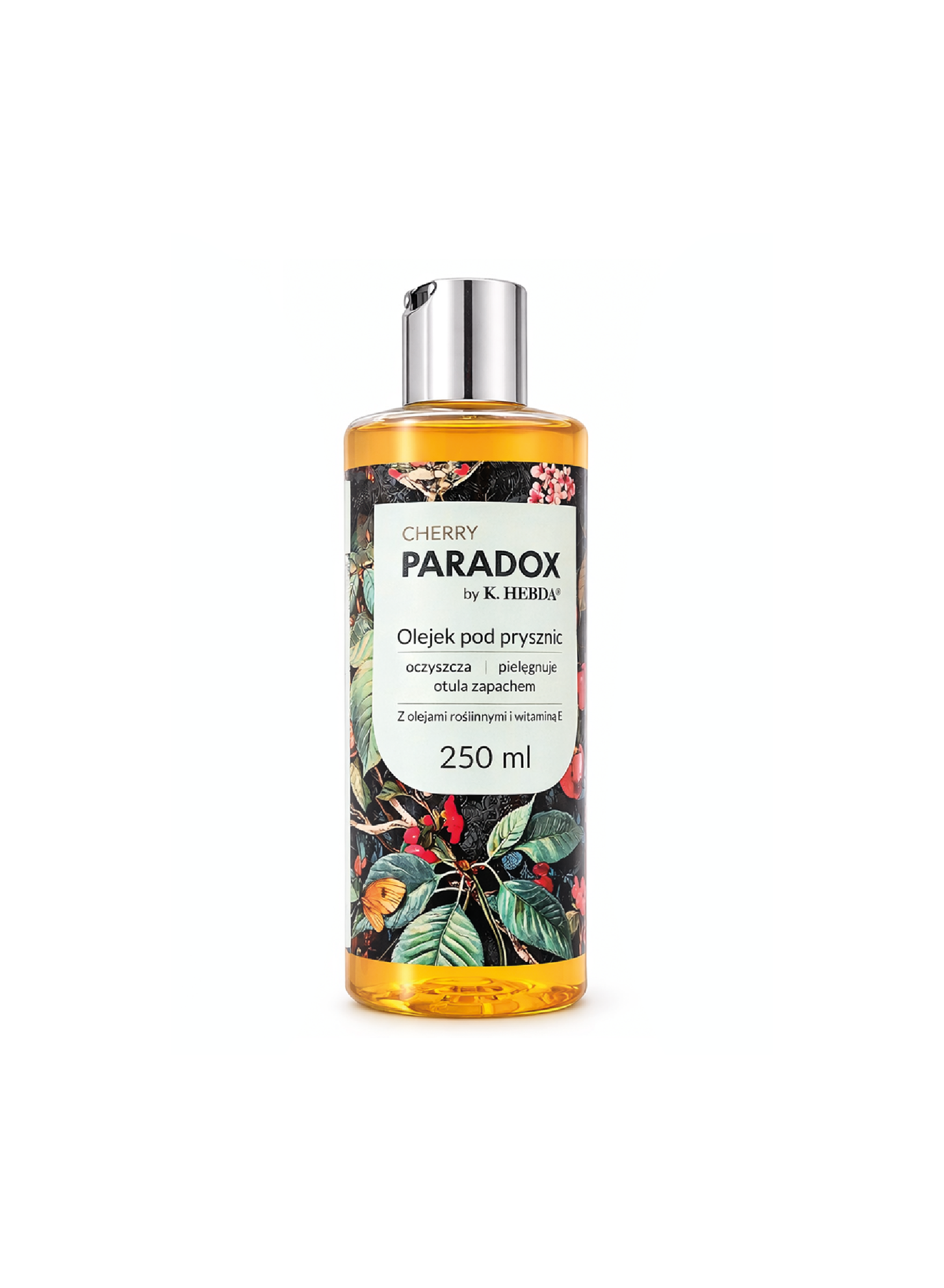 Otulający olejek pod prysznic Cherry Paradox z formułą oli to milk – packshot kosmetyku na białym tle + Discovery Set Paradox by K. Hebda – zestaw próbek perfum Cherry, Sea i Flower w eleganckim pudełku