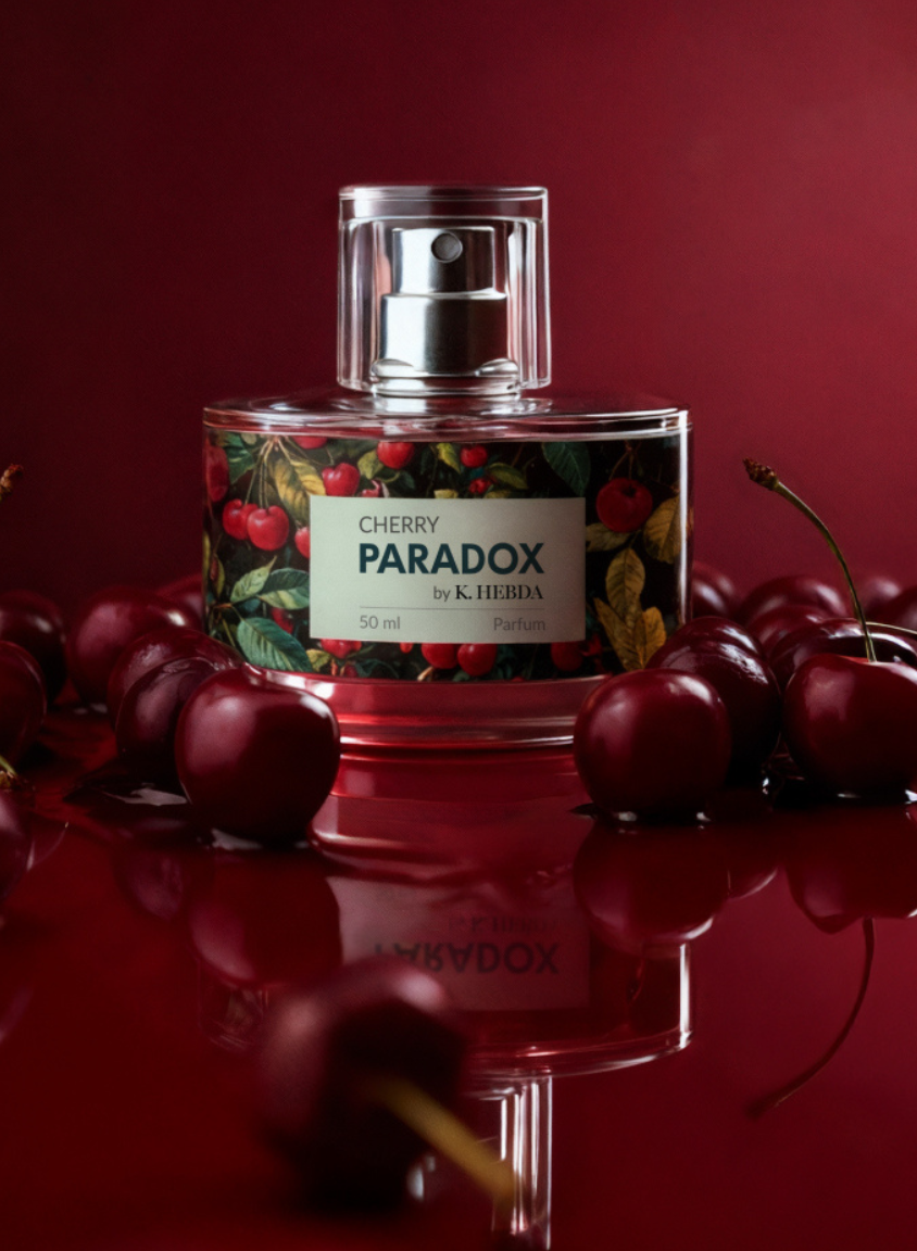 Packshot perfum Cherry Paradox na tle soczystych wiśni + Suchy olejek Cherry Paradox by K. Hebda na tle wiśni – pielęgnacja z nutą elegancji