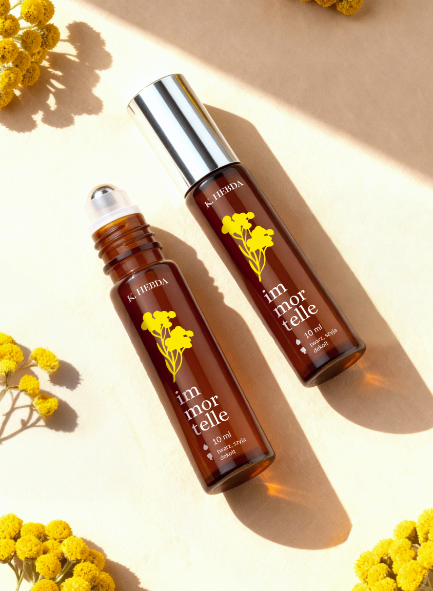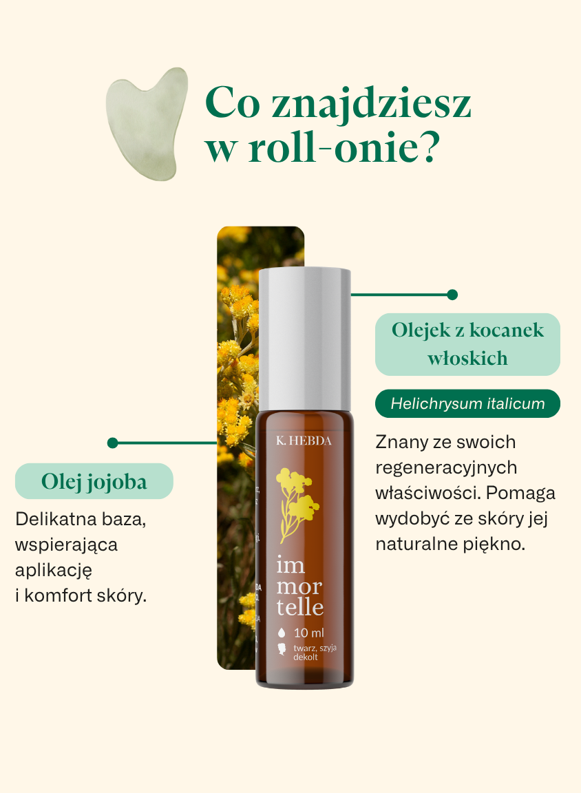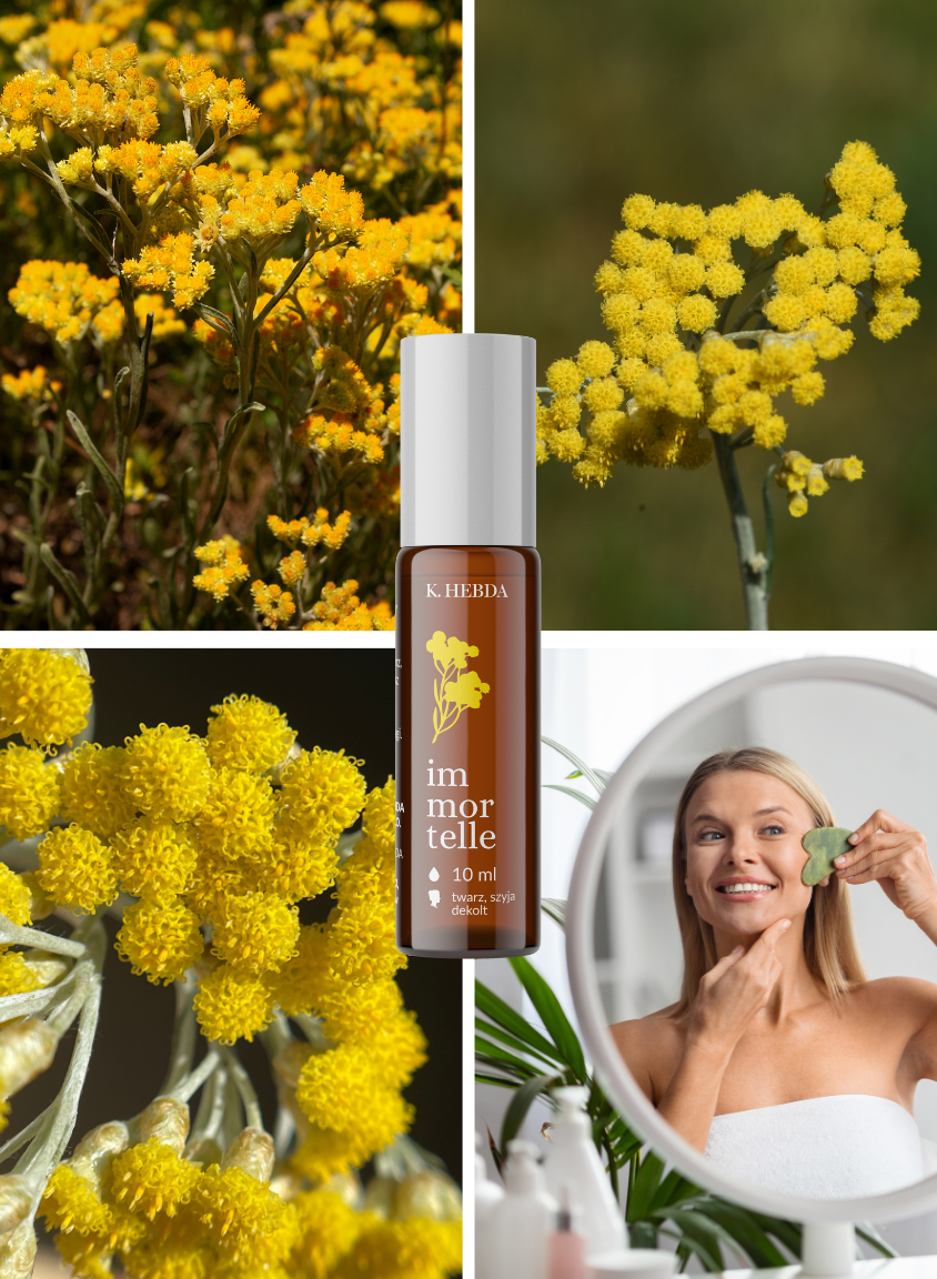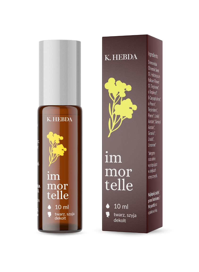 • jeden z najcenniejszych olejków świata, immortelle, nazywany „olejkiem młodości” i „złotem Prowansji” – skąpany w delikatnym oleju jojoba;