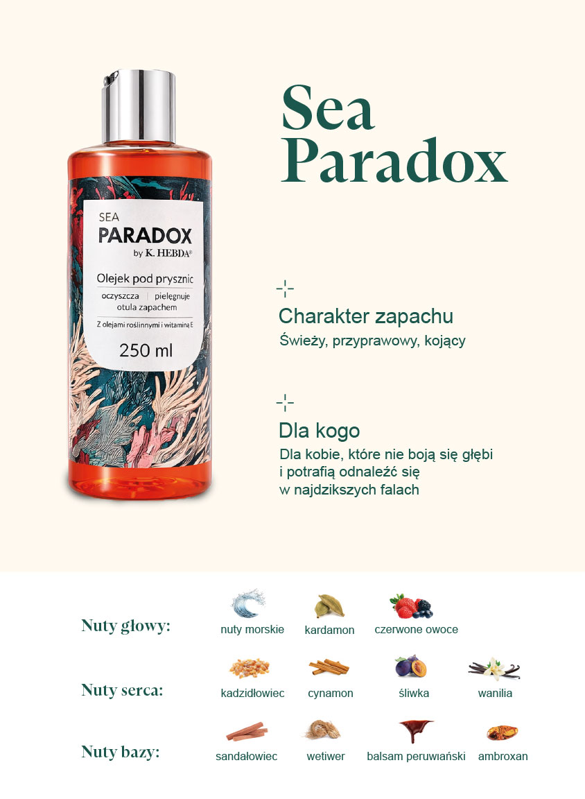Miękka, nawilżona i otulona skóra od razu po myciu? Z olejkiem do mycia Sea Paradox to prawda. I (jeśli tylko chcesz) możesz zapomnieć o kolejnych krokach pielęgnacji. Sea delikatnie oczyści Twoją skórę bez przesuszania, a subtelny zapach oceanu, kardamonu i czerwonych owoców zadba o Twoje zmysły. Czy może być piękniejsze połączenie?