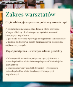 To wyjątkowa okazja, aby w kameralnej atmosferze poznać świat naturalnych olejków eterycznych, zdobyć rzetelną wiedzę i stworzyć własne aromaterapeutyczne produkty.