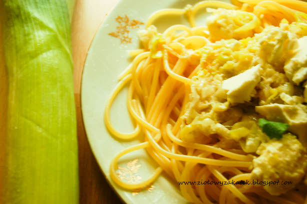 Dziś przedstawiam szybki obiad. Spaghetti z porami, serem feta oraz oregano. Podgrzany ser feta tworzy apetyczny sos. Przygotowuje się szybko, jest smaczne i pożywne.
