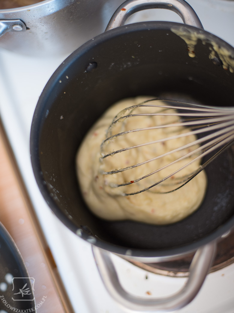 Ściągamy z ognia, dodajemy powoli mleko i ciągle ubijamy, doprawiamy solą i odrobiną pieprzu.