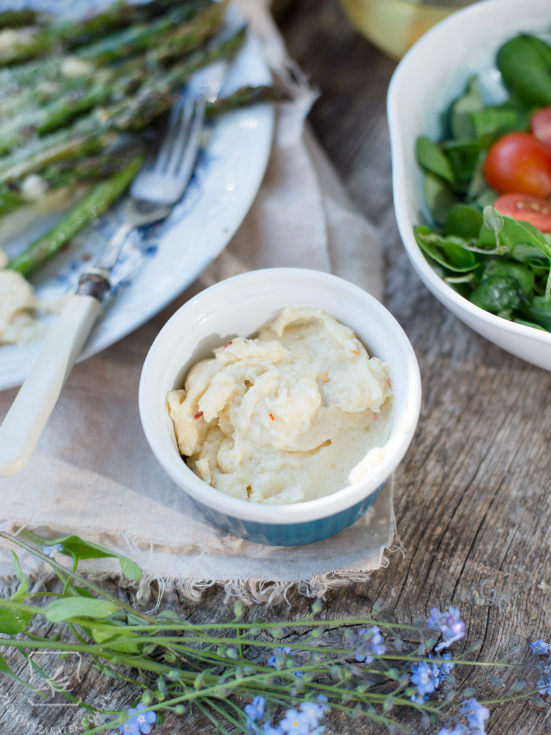 Sos béarnaise to ta biała „papka”, którą widzicie na zdjęciu:). Zazwyczaj jest mleczna i bardzo delikatna, jednak ja postanowiłam doprawić ją na ostro. To jest bardzo gęsta wersja sosu, taka, którą można nakładać spokojnie łyżką albo moczyć w niej szparagi – jej konsystencja przypomina wręcz gęsty budyń. Jeśli wolicie rzadszy sos: nic łatwiejszego! Trzeba po prostu zwiększyć ilość mleka.