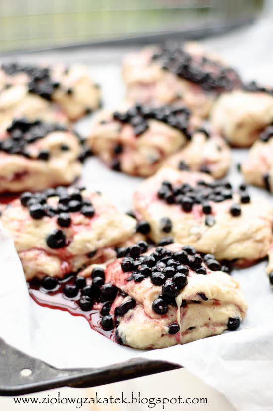 Kroimy ciasto ostrym nożem na kawałki i układamy na blasze do pieczenia. W bułeczkach robimy małe wgłębienie i łyżeczką nakładamy resztę borówek. Pozwalamy bułeczkom podrosnąć, jeszcze 20 minut smarujemy je masłem, posypujemy cukrem czym wkładamy je do rozgrzanego do 180 C piekarnika i pieczemy około 25 minut.