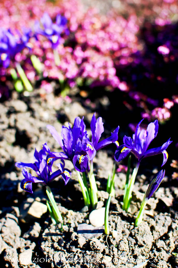 Miniaturowy irys oraz różowe, wiosenne wrzośce.