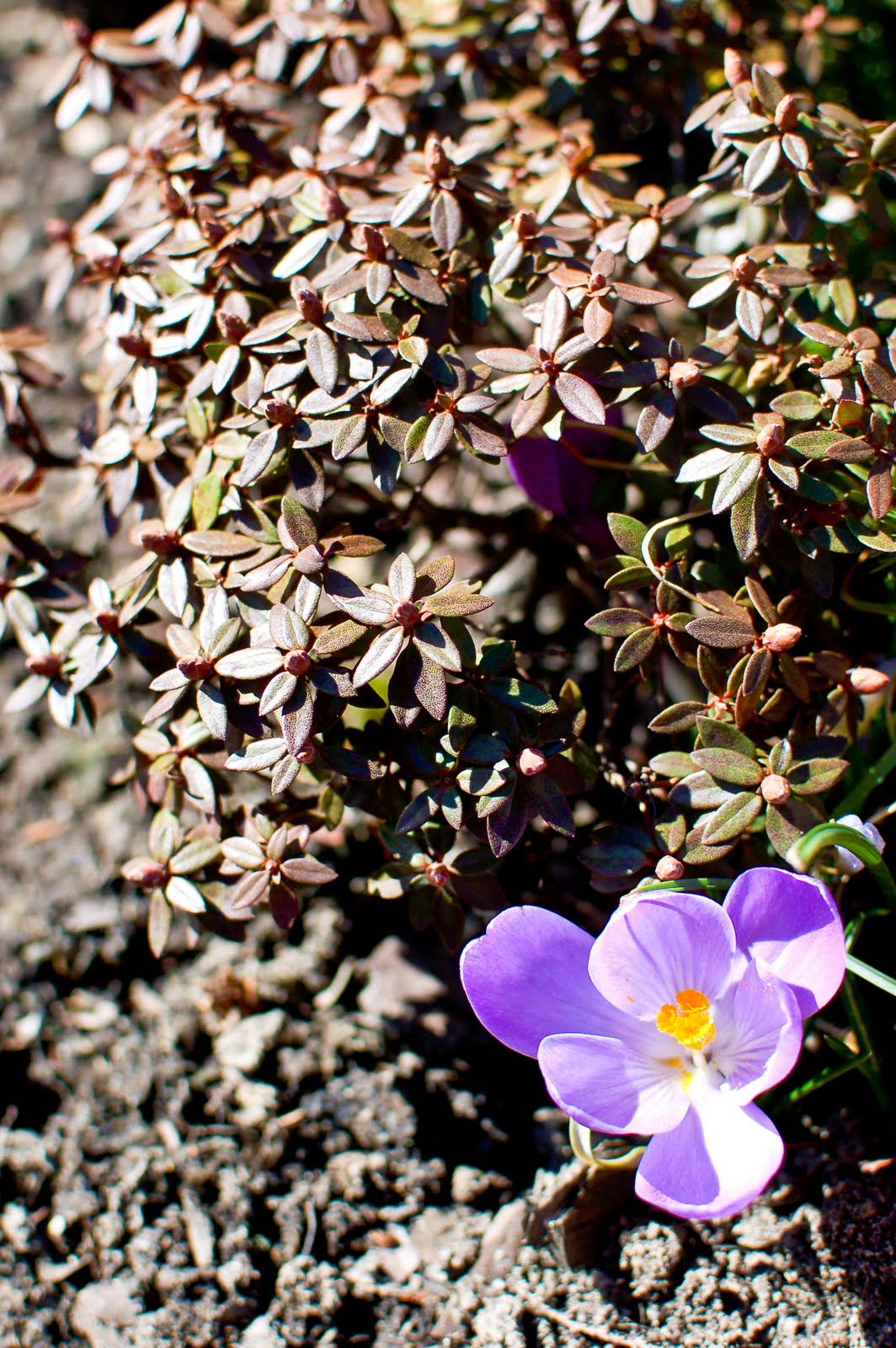 W tle: rododendron karłowaty. Możecie zobaczyć już zawiązane pączki. Obłędnie kwitną późną wiosną (a mamy mnóstwo różaneczników w ogrodzie!)