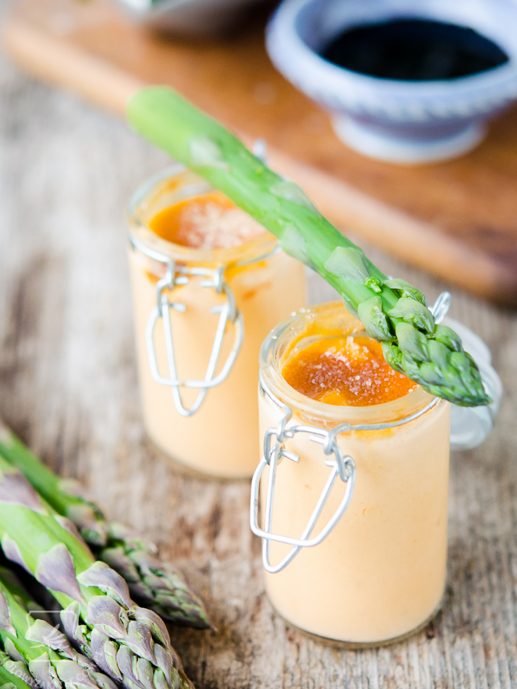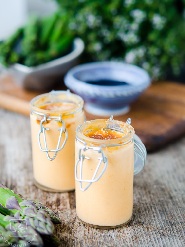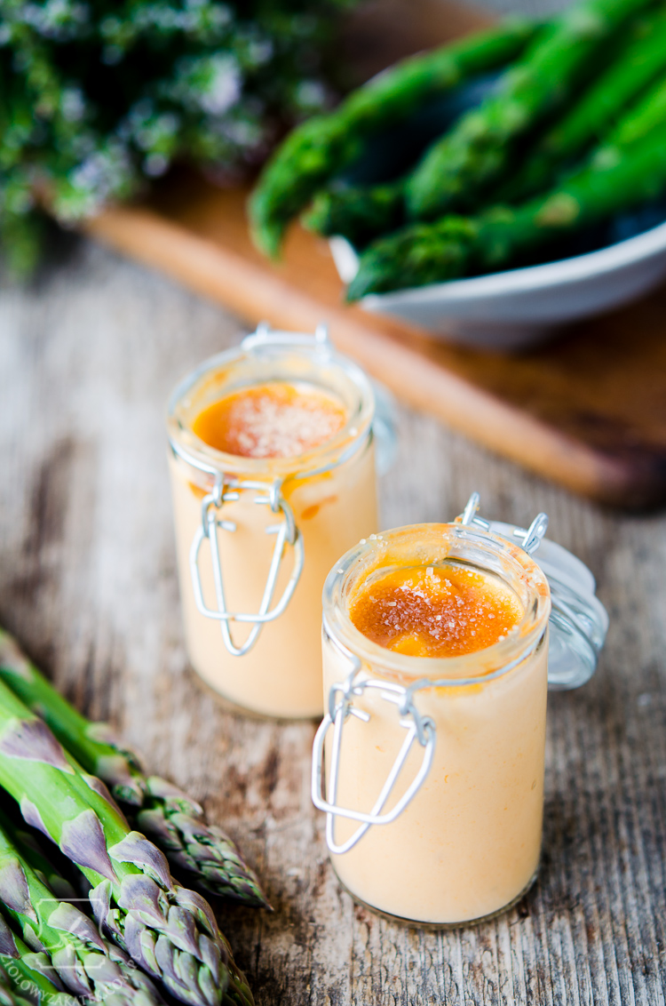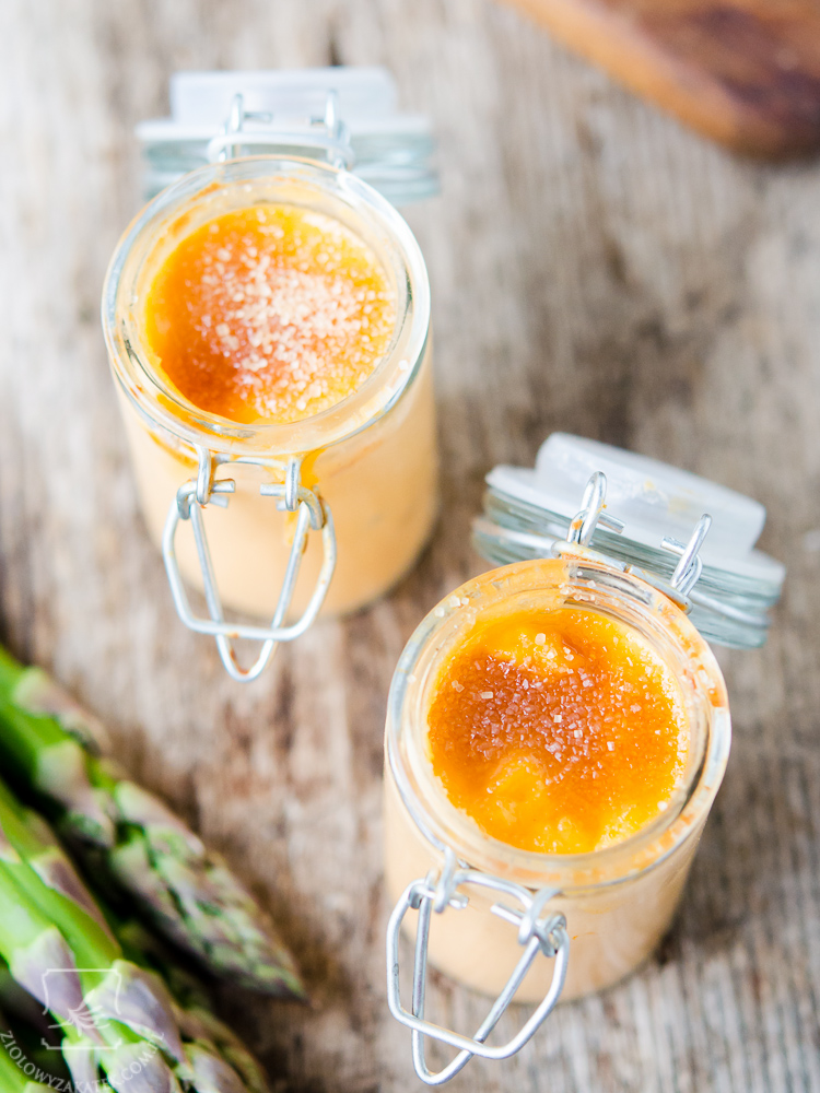 Krem brulee podałam jako przystawkę z gotowanymi (byle nie za długo!) szparagami oraz odrobiną octu balsamicznego do przełamania smaku.Mojemu Panu, który jest miłośnikiem sera (prawie) pod każdą postacią bardzo smakowało: trochę tak, jakbyście jedli miniaturowe founde w słoiczku.
