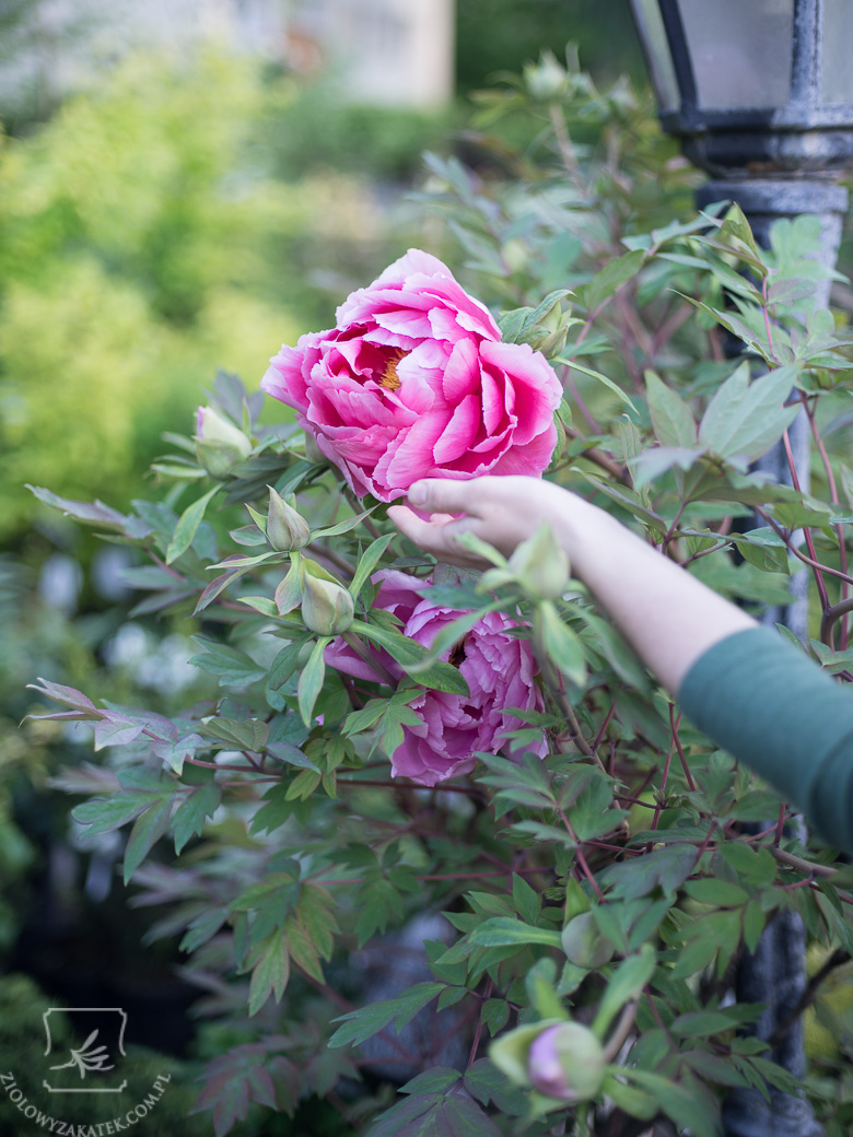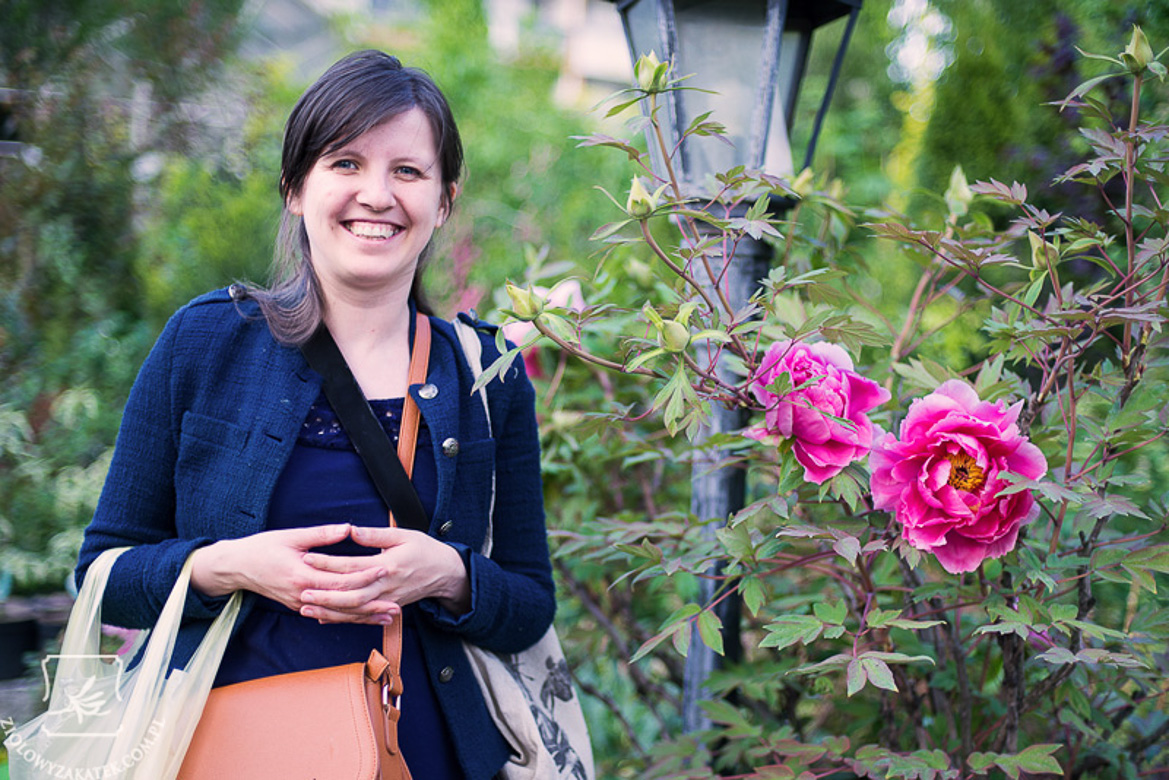 Już Was dalej nie męczę. Chciałam Wam tylko pokazać jedną roślinę przy wyjściu, która od razu zwróciła moją uwagę. Oto piwonia drzewiasta. Jest przepiękna, z olbrzymimi kwiatami! Poprosiłam Magdę, żeby delikatnie podłożyła pod nią dłoń, abyście mogli zobaczyć jakie olbrzymie ma kwiaty!