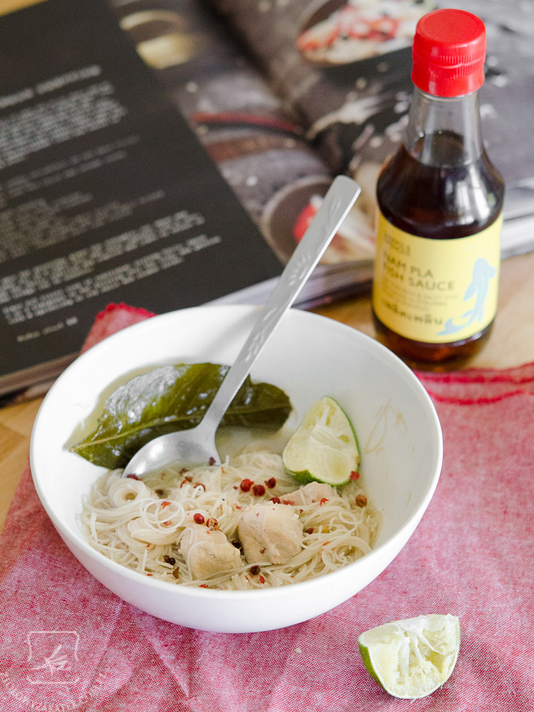 Jeśli mamy rosół i pozostałe składniki, dodawanie kurczaka jest praktycznie zbędne – płyn jest pyszny sam w sobie, piliśmy go potem po prostu z miseczek :-) Można dołożyć ulubiony rodzaj makaronu, dodać inny rodzaj mięso, lub mięso zupełnie pominąć. Wybór należy do Was! Na wszelki wypadek podam jednak, co należy dodać do rosołu na modłę azjatycką. Inspiracją do obydwu przepisów był dla mnie Rick Stein i jego świetna książka Rick Stein’s Far Eastern Odyssey.
