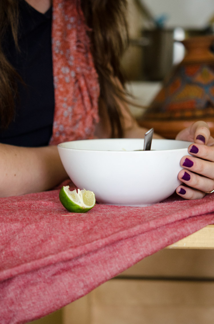 Zupę można podawać z kolendrą, makaronem, kurczakiem (jeśli uwzględnimy go w przepisie), moim zdaniem jedzona samodzielnie też jest bardzo pożywna.